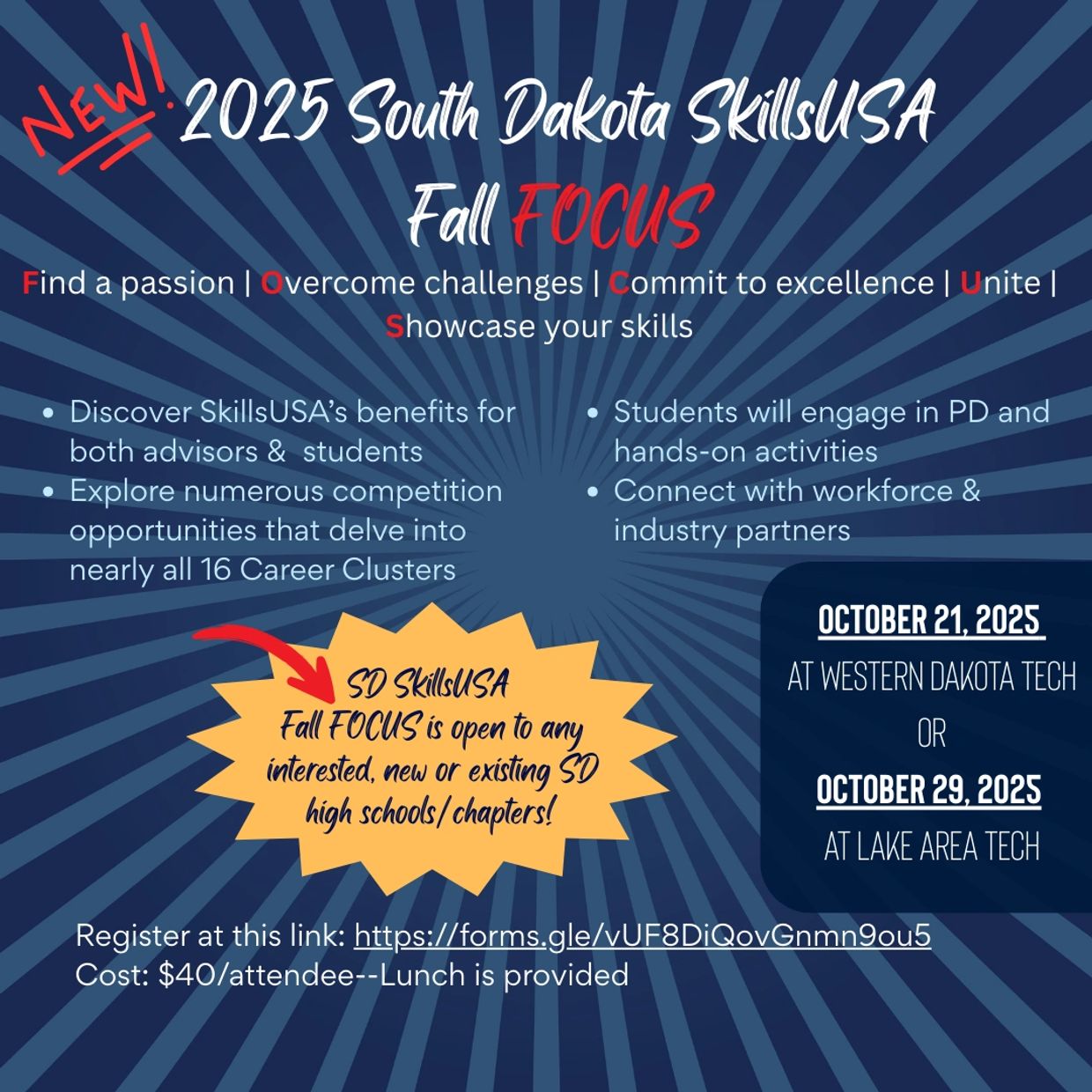 Join us this fall for SD SkillsUSA Fall FOCUS—an action-packed day of hands-on activities, leadership training, and exploration designed to ignite student potential and build future workforce leaders. Open to new & existing SkillsUSA chapter members.